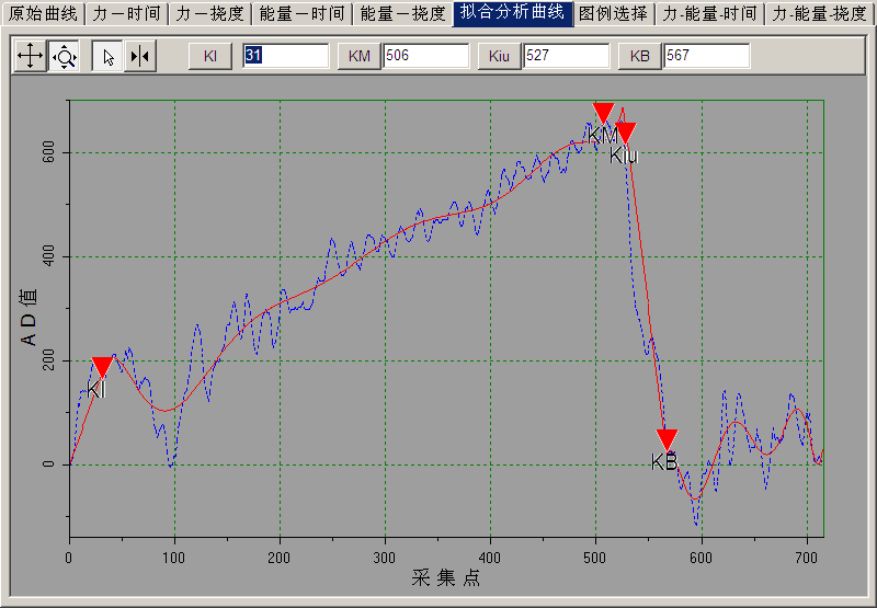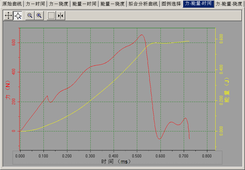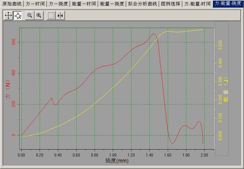 1、可直觀顯示原始曲線、力-時(shí)間、力-撓度、能量-時(shí)間、能量-撓度、分析曲線等曲線。