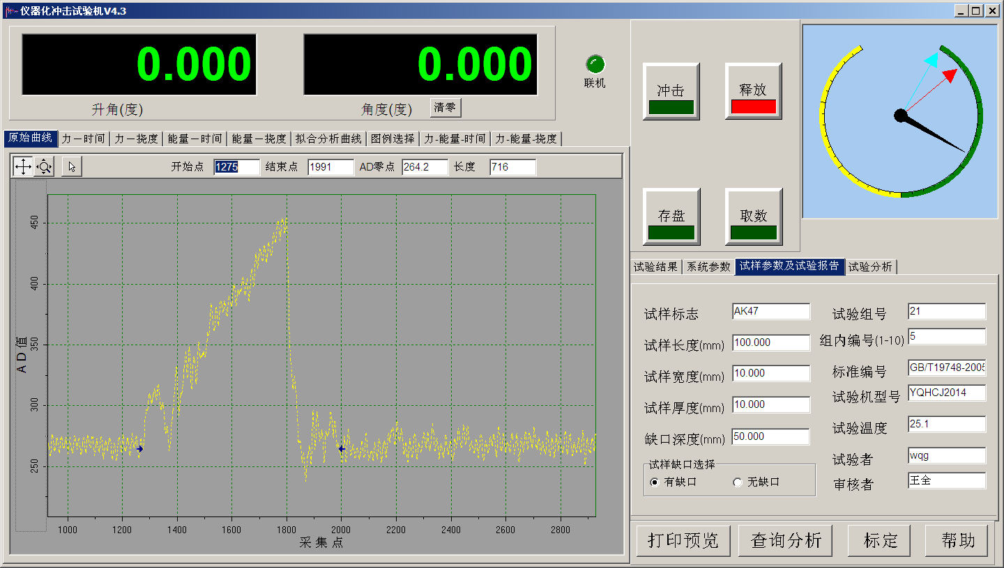 其一是儀器化擺錘沖擊試驗(yàn)機(jī)與普通試驗(yàn)機(jī)主要不同點(diǎn)是儀器化(數(shù)字化):即控制、能量顯示及沖擊曲線的采集和處理均實(shí)現(xiàn)數(shù)字化。沖擊試驗(yàn)結(jié)果用圖形顯示使之形象化,獲得沖擊力-時(shí)間、沖擊力-撓度等曲線;